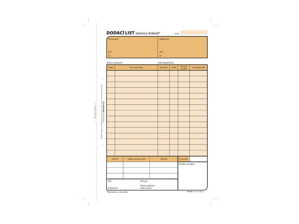 tiskopis splňuje všechny platné požadavky zákona o DPHsamopropisovacínečíslovanýformát A5 na výškuobsahuje 100 listů odtržitelných perforací, se zakládacím děrovánímperforace v levé části tiskopisuDoplňkové parametry