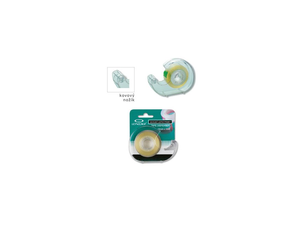 jednoduchý plastový odvíječ pásek z transparentního materiálu s kovovým nožem, v různých barevných variantách, na pásku šíře do 19 mm a návinu 33 m, dodáván s lepicí páskouDoplňkové parametry